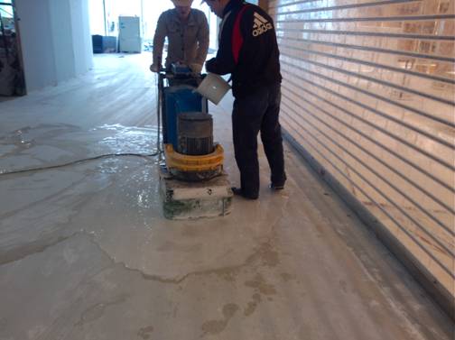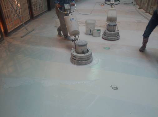 待石材填縫膠完全固化,用50#、100#、150#剪口研磨片打磨,要把不平的臺階磨平,時間比較長。強(qiáng)烈建議使用12磨頭以上重型翻新機(jī)打磨、推平剪口,小型翻新機(jī)壓力不夠容易出現(xiàn)波浪紋,翻新機(jī)走“井字形”進(jìn)行打磨,臺階大的地方,最好先用手持拋機(jī)將高出的部分先打磨平。