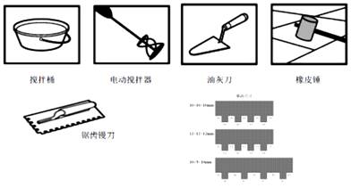 紙面石膏板或紙板、十字定位器(控制接縫寬度)、攪拌桶、電動攪拌機、鋸齒鏝刀、油灰刀、橡皮錘、水平尺等。詳見下圖4-1。