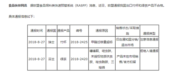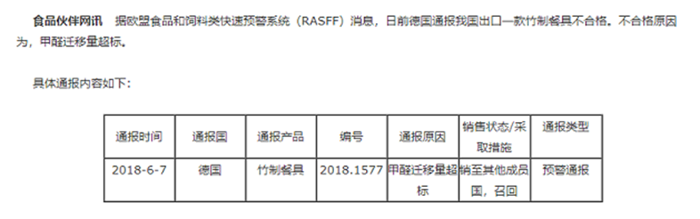 近期,一批中國浙江產(chǎn)竹纖維餐具因存在化學(xué)危害風(fēng)險遭到歐盟(RASFF)通報,通報稱該批出口斯洛伐克的竹纖維碗,被發(fā)現(xiàn)甲醛遷移指標(biāo)不合格的問題,不符合歐盟塑料食品接觸材料法規(guī)(EU)No10/2011的要求。目前被通報產(chǎn)品已被進口商作下架處理。