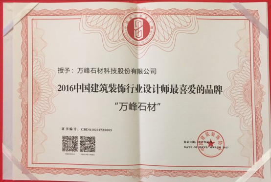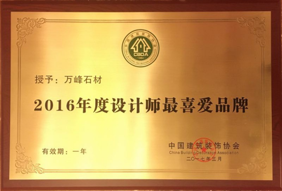 “2016中國建筑裝飾行業(yè)設計師最喜愛的品牌”獎是中國建筑裝飾界公認的獎項,極具權威性和影響力,榮獲獎項對于石材未來在市場中的開拓,起著重要的作用。