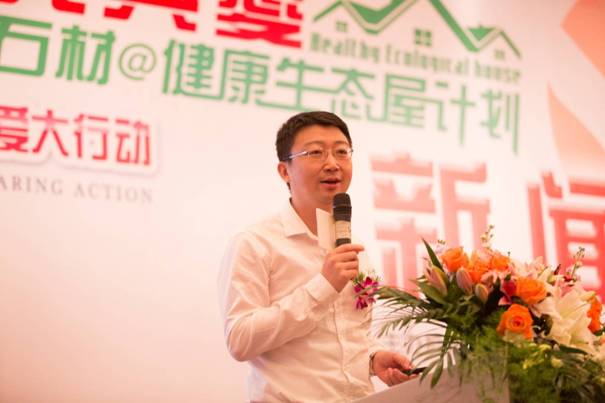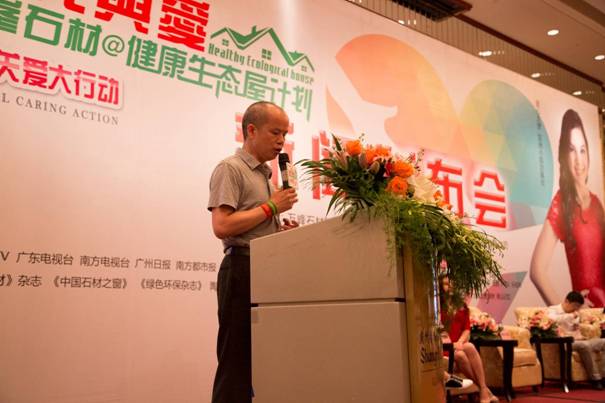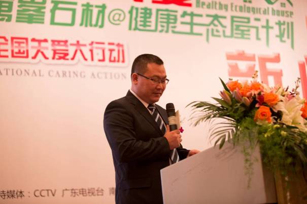 此次發(fā)布會(huì)由“陽光與愛”主題宣傳短片拉開序幕。首先,由萬峰石材科技股份有限公司總裁林志偉致辭。林總裁對(duì)各位到場(chǎng)領(lǐng)導(dǎo)、嘉賓以及媒體表示了熱烈的歡迎,并在講話中表示,萬峰石材的產(chǎn)品,原材料,以及生產(chǎn)過程都注重健康環(huán)保,綠色生態(tài)。萬峰石材與北京新陽光慈善基金會(huì)合作,意在全國(guó)范圍內(nèi)推廣綠色環(huán)保家居概念,關(guān)注環(huán)保家居和健康生活,。