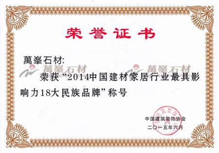殊榮二:中國建材家居行業(yè)最具影響力18大民族品牌