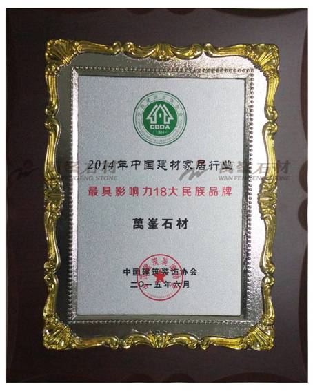 此榮譽(yù)是經(jīng)過中國建筑裝飾界專家評(píng)審團(tuán),對整個(gè)建材家居產(chǎn)業(yè)的品牌進(jìn)行全面的評(píng)估而選出。去年,石材也榮獲此榮譽(yù)。今年,再次榮膺,是行業(yè)對石材品牌影響力的高度認(rèn)可。