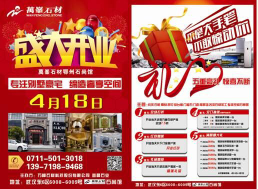 4月18日,在熙熙攘攘的人群簇?fù)碇,位于鄂州武漢東國際建材城的石材石尚館盛大落成。除了隆重的開業(yè)儀式外,鄂州石尚館劍指家裝市場,著實拿出了實實在在的五重政策,讓利廣大的鄂州消費(fèi)者,F(xiàn)場熱鬧非凡,盛況空前。