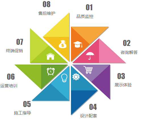 三、提升品牌附加值。這些新價(jià)值包括品質(zhì)監(jiān)控、咨詢(xún)解答、展示體驗(yàn)、設(shè)計(jì)配套、施工指導(dǎo)、運(yùn)營(yíng)培訓(xùn)、終端促銷(xiāo)、售后維護(hù)等等,涵蓋了消費(fèi)者接觸品牌到落地實(shí)用的整個(gè)過(guò)程中。