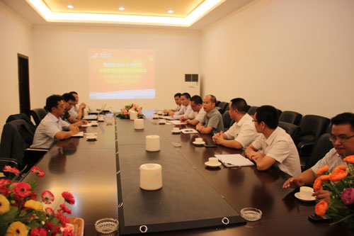 萬峰石材科技有限公司總裁林志偉與韓國LG.Hausys考察團(tuán)在會議室進(jìn)行商務(wù)洽談