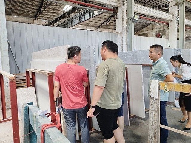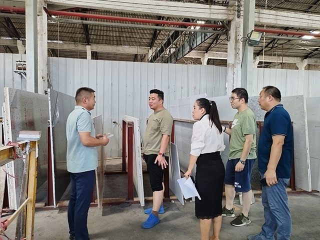當(dāng)天下午,在公司技術(shù)總監(jiān)尹興、銷售部項(xiàng)目經(jīng)理張靜、品管部經(jīng)理曹廣等領(lǐng)導(dǎo)的陪同下,參觀了壓制生產(chǎn)線、排鋸及拋光生產(chǎn)線等,隨后到成品倉查看該生產(chǎn)批次的成品。